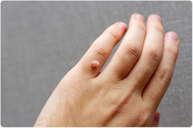A wart is a small, rough growth resembling a cauliflower or a solid blister. It typically occurs on human’s hands or feet but often in other locations. Warts are caused by a viral infection, specifically by one of the many types of human papillomavirus (HPV). There are as many as 10 varieties of warts, the most common considered to be mostly harmless. It is possible to get warts from others; they are contagious and usually enter the body in an area of broken skin. Warts are usually asymptomatic except when they occur on weight-bearing areas.